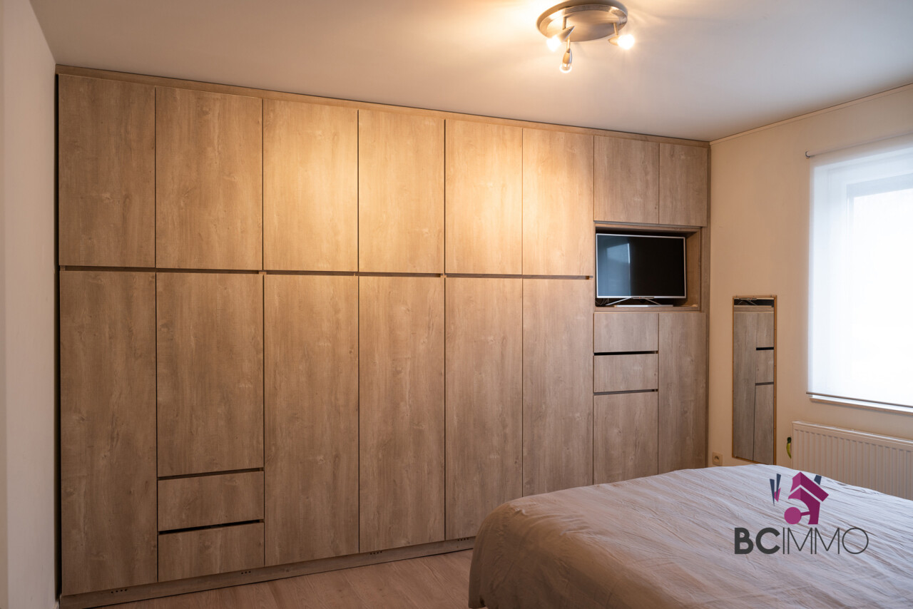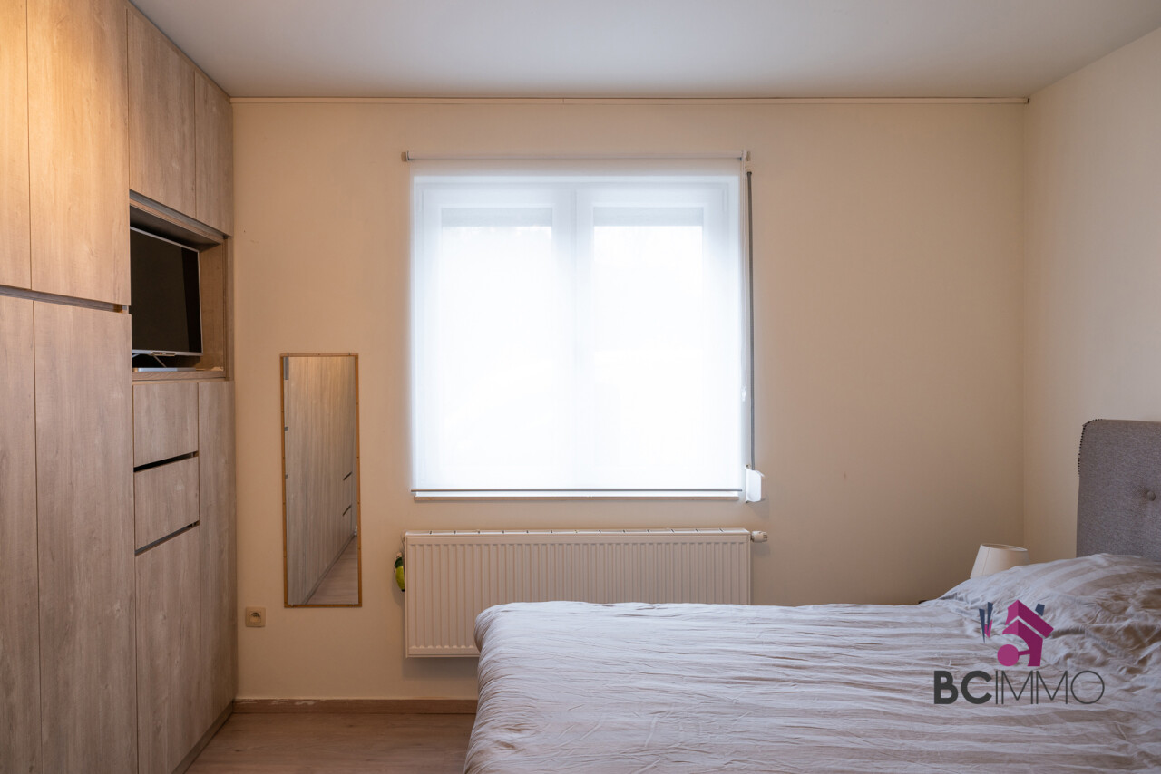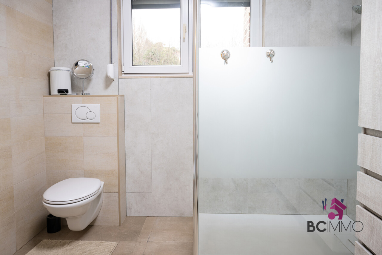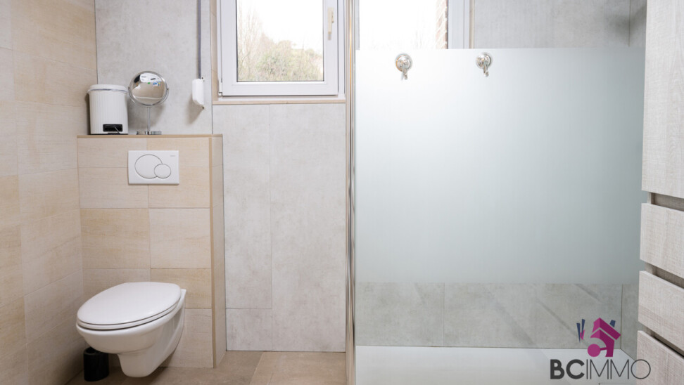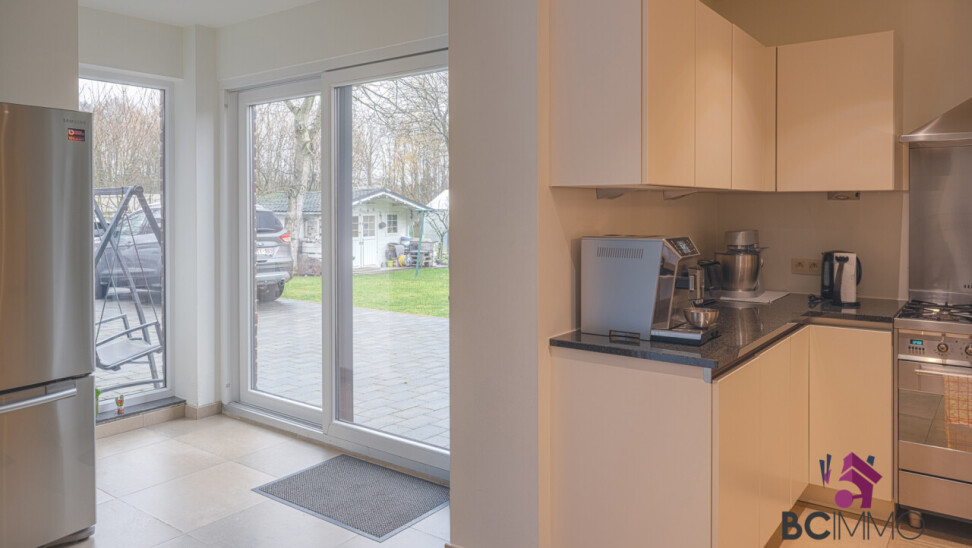 Op het gelijkvloers (ongeveer 140 m2) vind je de inkomhal met toegang tot de ruime en lichtrijke living, een moderne keuken, een badkamer, 2 slaapkamers, een grote bergruimte en een tuin.