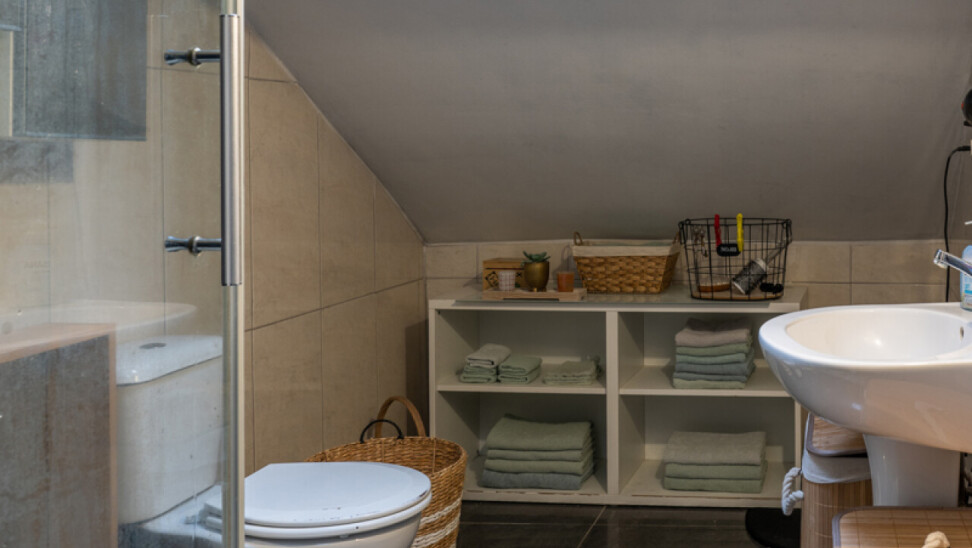 Via een houten trap ga je naar de eerste verdieping met een badkamer, een wasplaats en een slaapkamer met ingebouwde kasten.